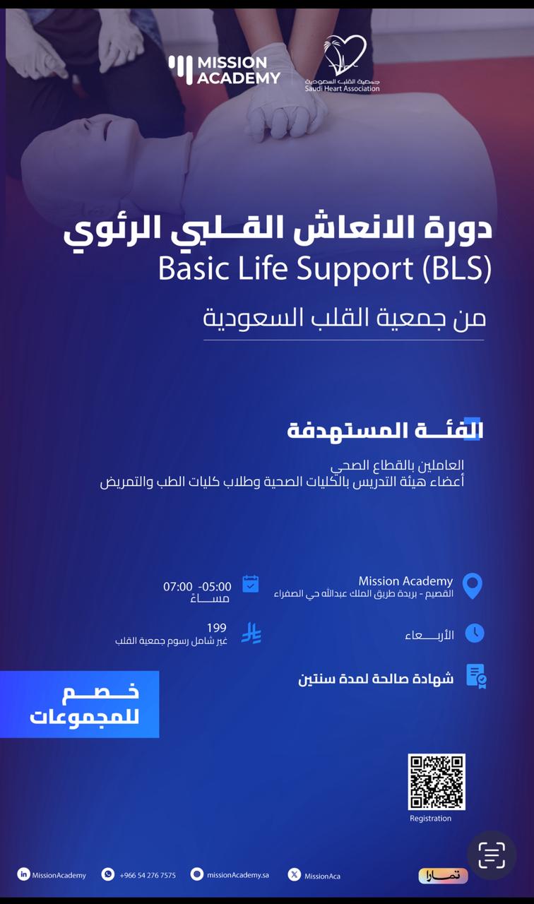 The Basic Life Support (BLS) course is a practical, in-person training program delivered by Mission Academy in collaboration with the Saudi Heart Association.
